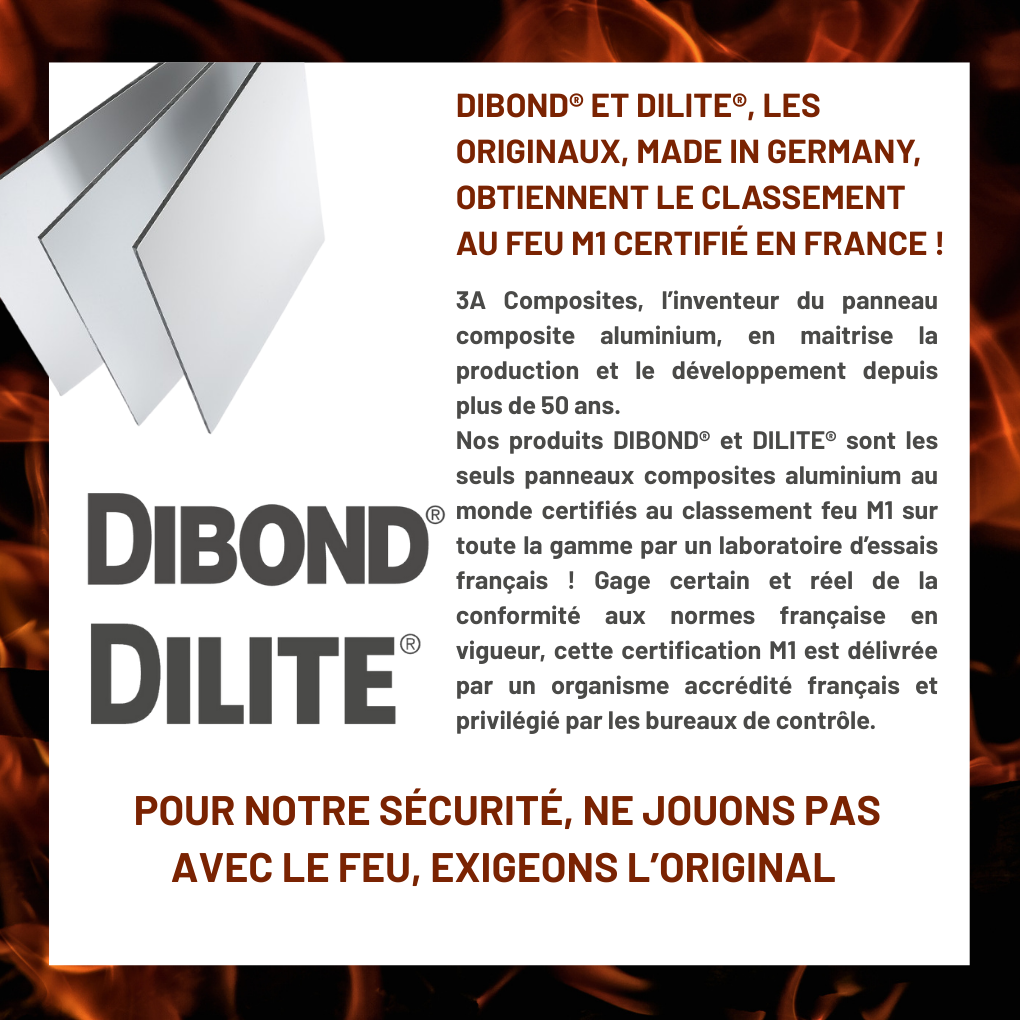 • Blanc FR : Classé feu B-s1, d0 selon la norme européenne 13501, le DIBOND® Blanc FR répond aux applications avec une exigence forte de la prévention des incendies (endroits publics).